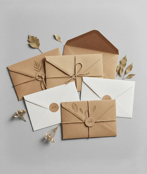 Sustainable envelopes crafted from recycled or responsibly sourced papers. Featuring natural textures and subtle tones for an authentic eco-conscious look – without compromising on quality or style.